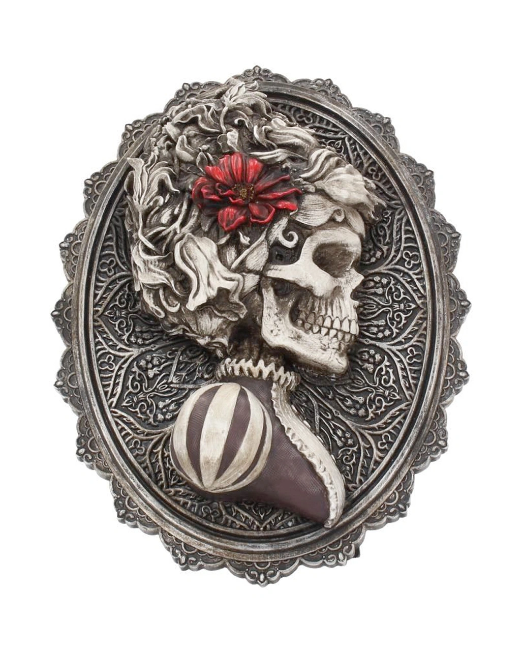 Diese einzigartige Gothic Deko macht langweilige Wände zum atemberaubenden Blickfang. Unser Gothic Skelett Dame Day of the Dead Wand- & Standbild zeigt das Camee Skelett einer Edwardischen Dame. Das Bild hat eine ovale Form und zeigt das erhabene Relief einer Dame mit roter Rose. Das filigrane Ornamentmuster und die hochwertige Verarbeitung machen diese Kamee Stil Gothic Deko zum perfekten Geschenk!