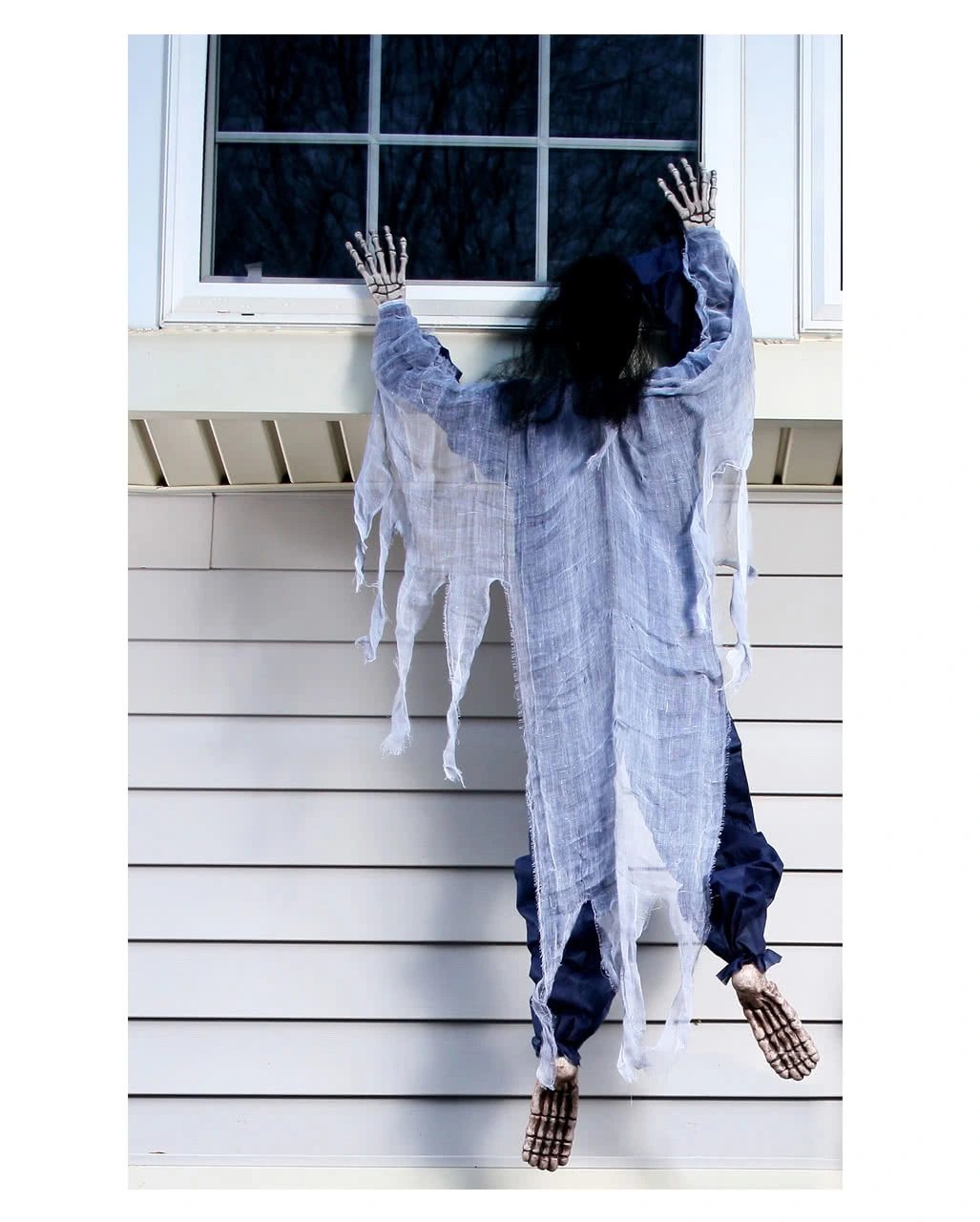 Das weiße Fassadenkletter Skelett mit den langen schwarzen Haaren auf seinem gruseligen Totenschädel besitzt Befestigungshaken an den Händen und lässt sich so ideal an Fenster und Hauswand dekorieren. Dazu passen auch die Blutspritzer für dein Fenster und der Clown Skelett Geist auf der Schaukel.